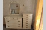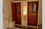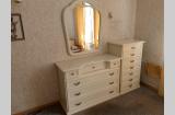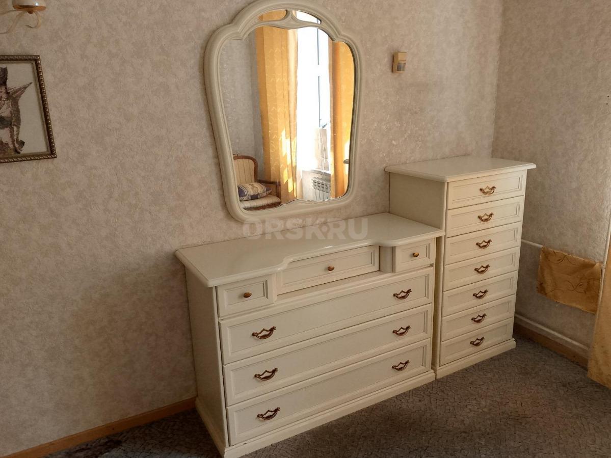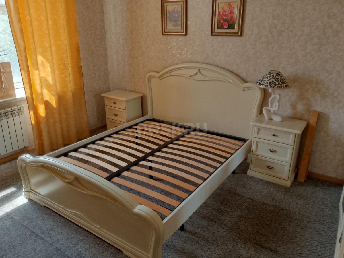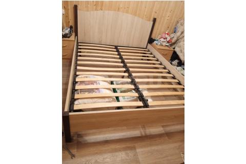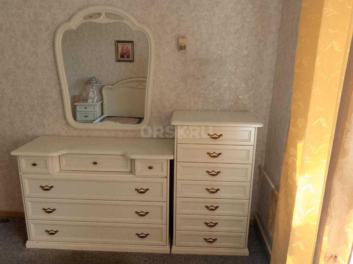 Кровать, две прикроватных тумбы, шкаф, комод, зеркало, туалетный стол/комод. На кровати установлены новые ламели. Шкаф с откидной системой верхней вешалки.
