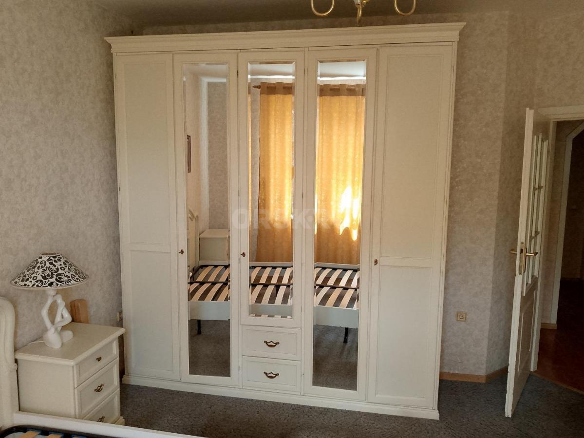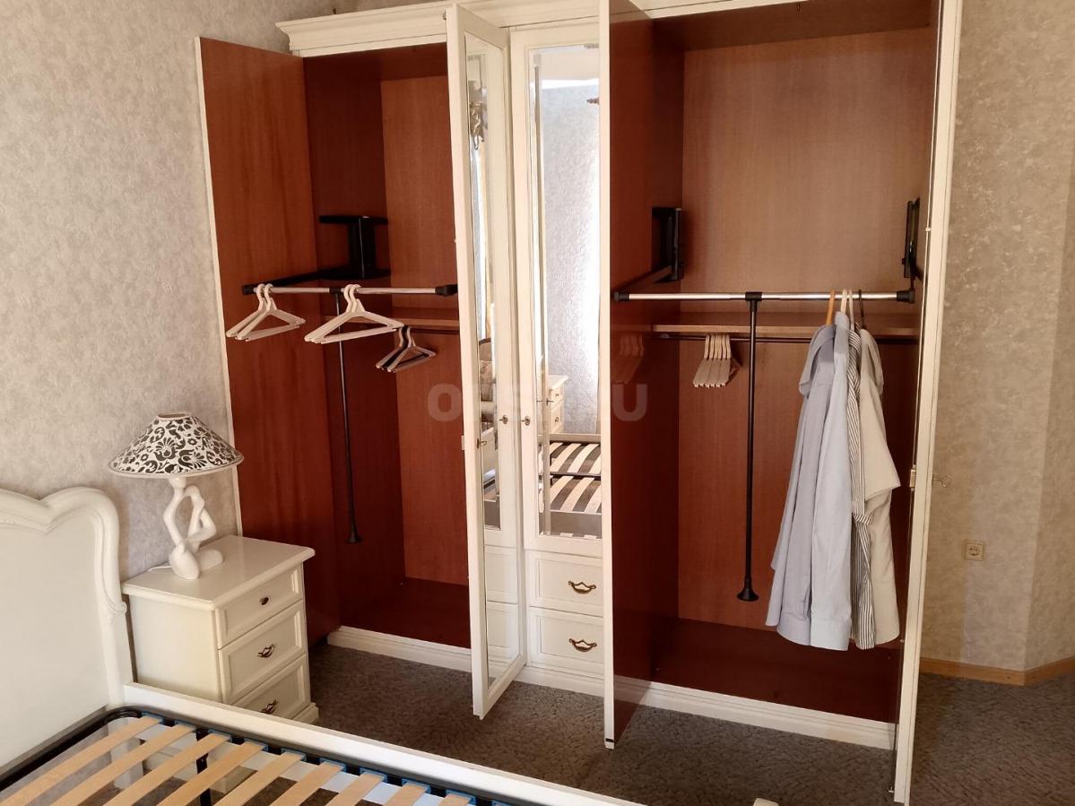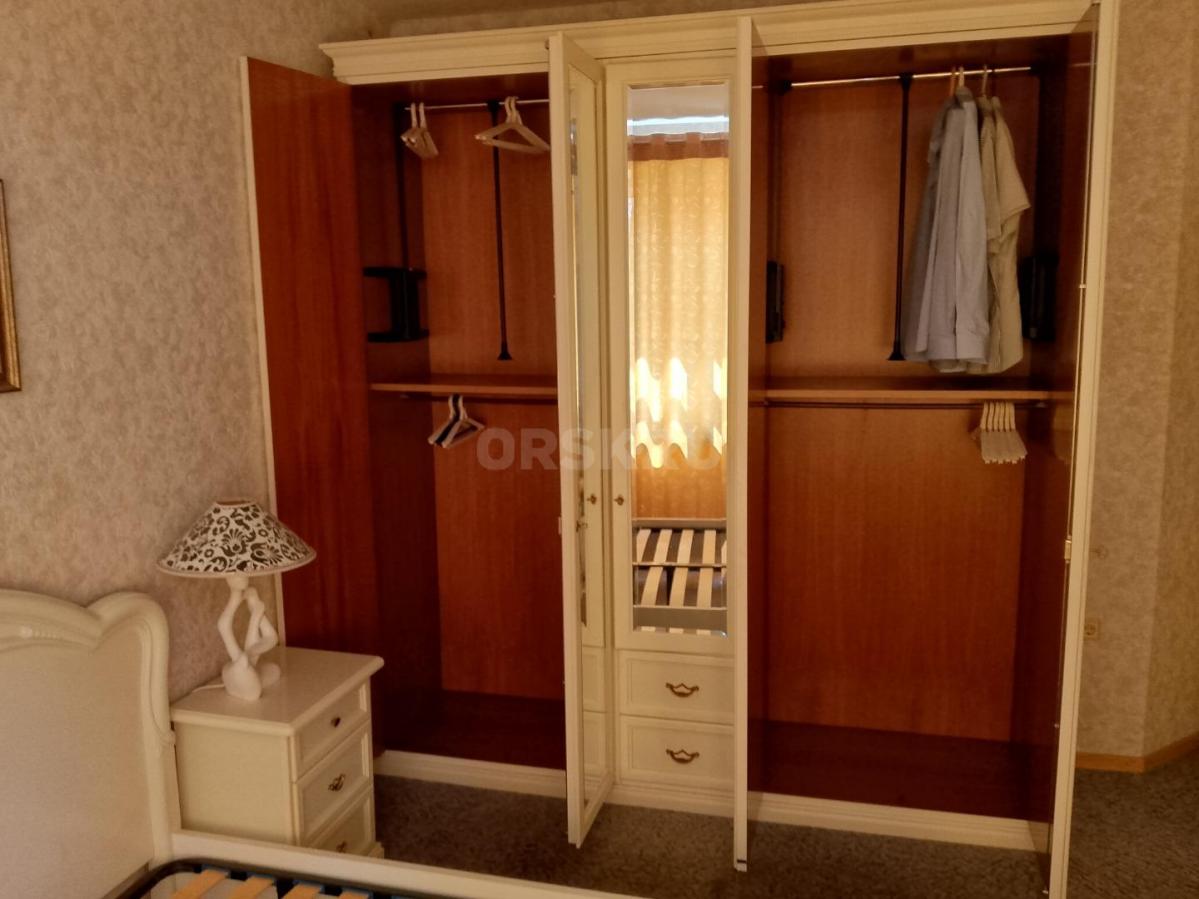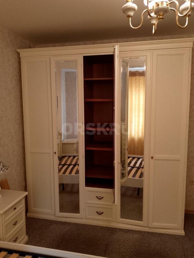 Кровать, две прикроватных тумбы, шкаф, комод, зеркало, туалетный стол/комод. На кровати установлены новые ламели. Шкаф с откидной системой верхней вешалки.