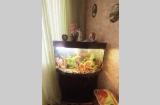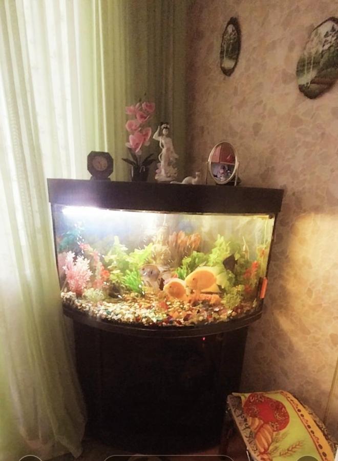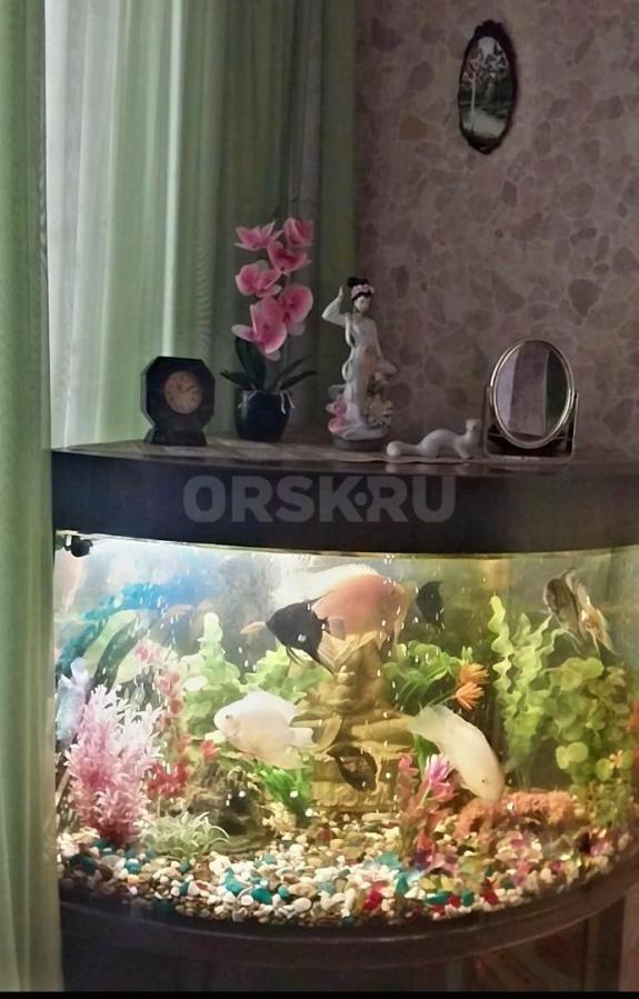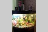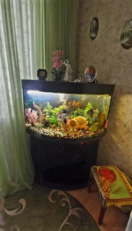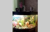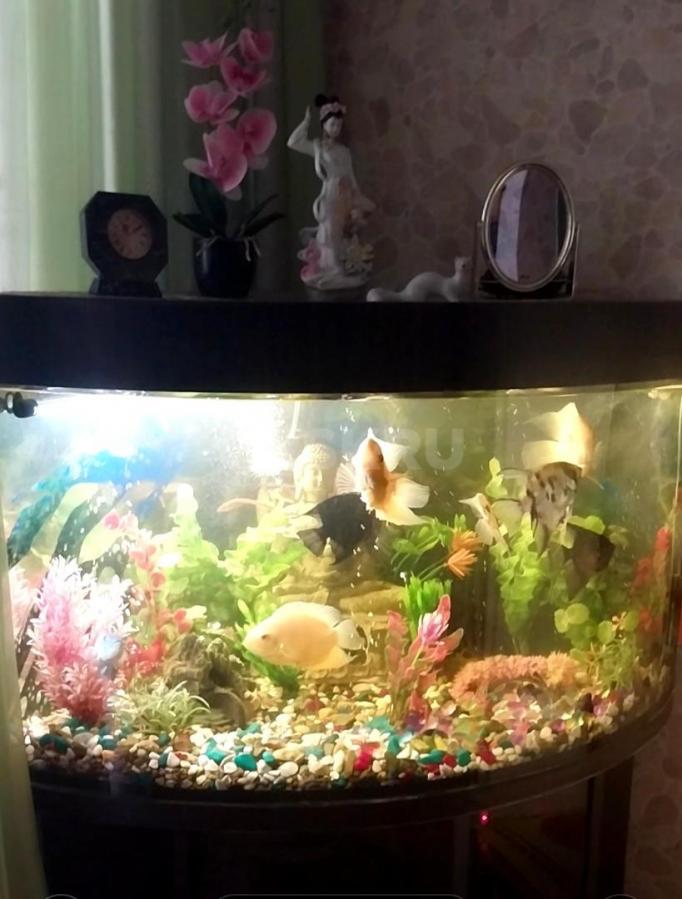 Угловой аквариум с тумбочкой, крупными рыбками- Северум, Скалярии, Боции- 11 штук, погружными лампами, фильтром для очистки воды, компрессором воздуха и др.