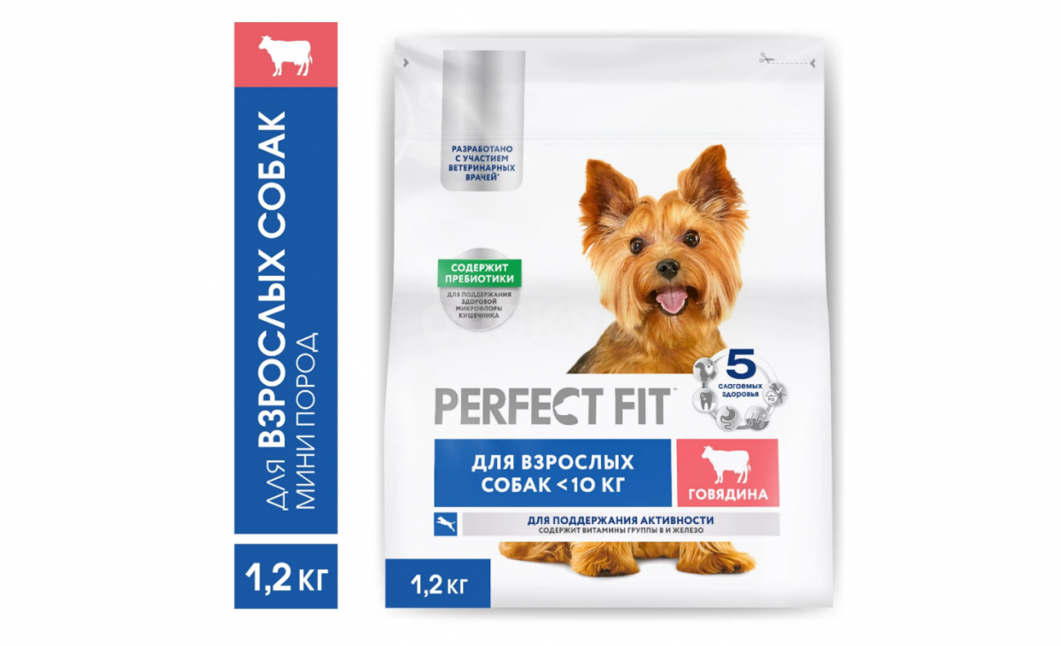 Корм сухой для взрослых собак PERFECT FIT с говядиной, для взрослых собак мелких и миниатюрных пород 1,2 кг 1 пачка.